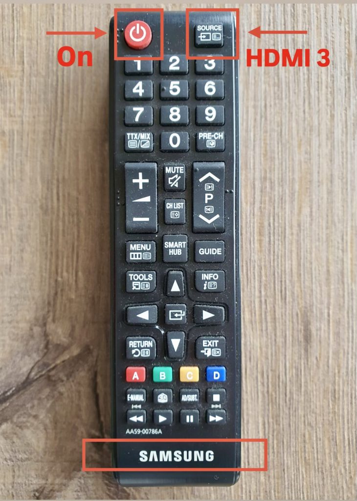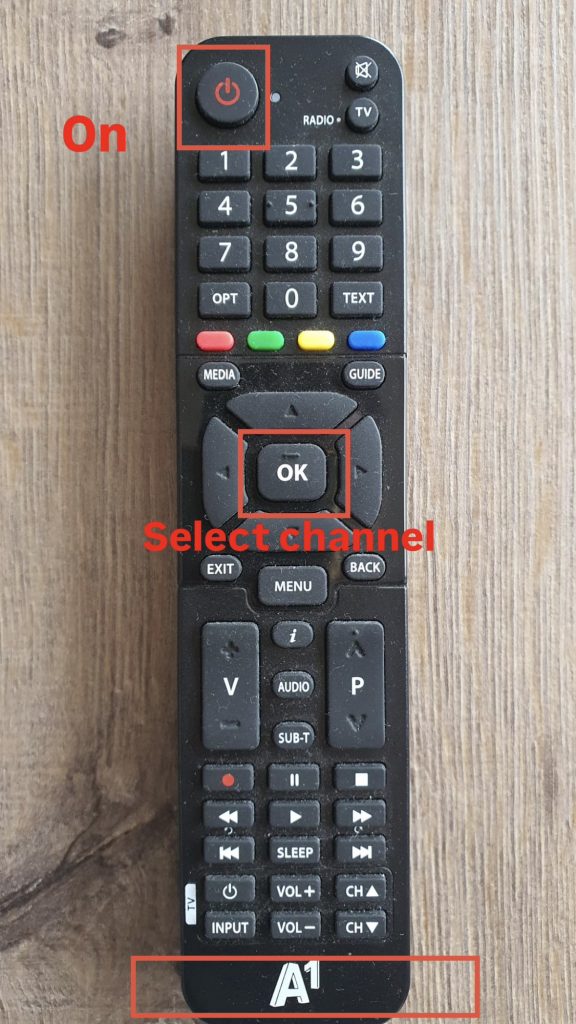 < backnext >TVYou have 2 remote controls for the TV:1 for the TV (SAMSUNG) and 1 for the satellite receiver (A1). Samsung remote control: Press the ON key (red)With the button next to it (see photo) set to HDMI 3 A1 remote control:Press the ON keyPress the OK key / Select program